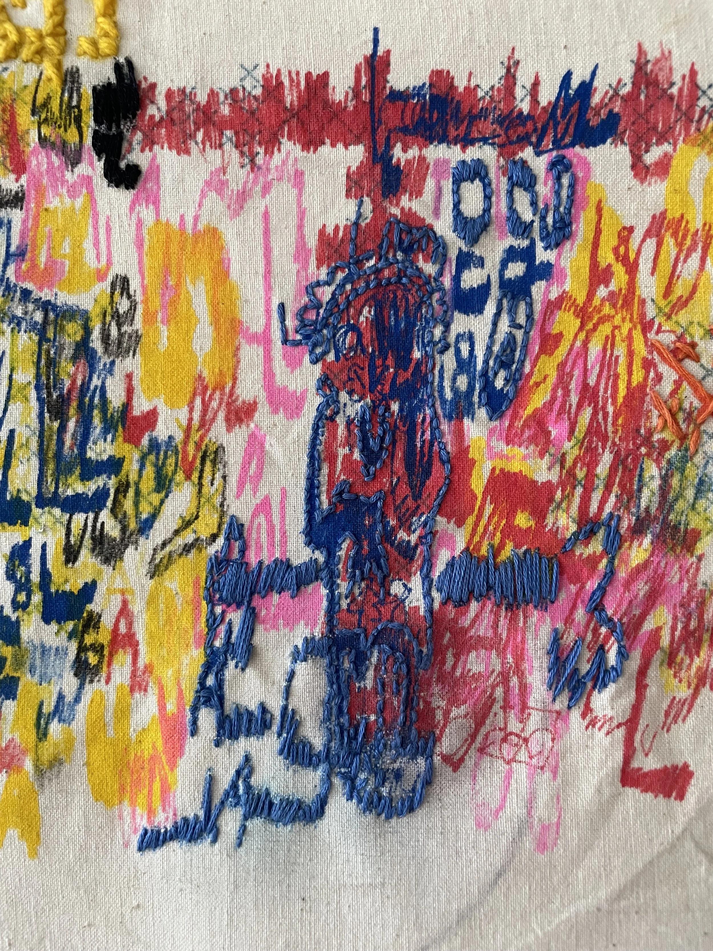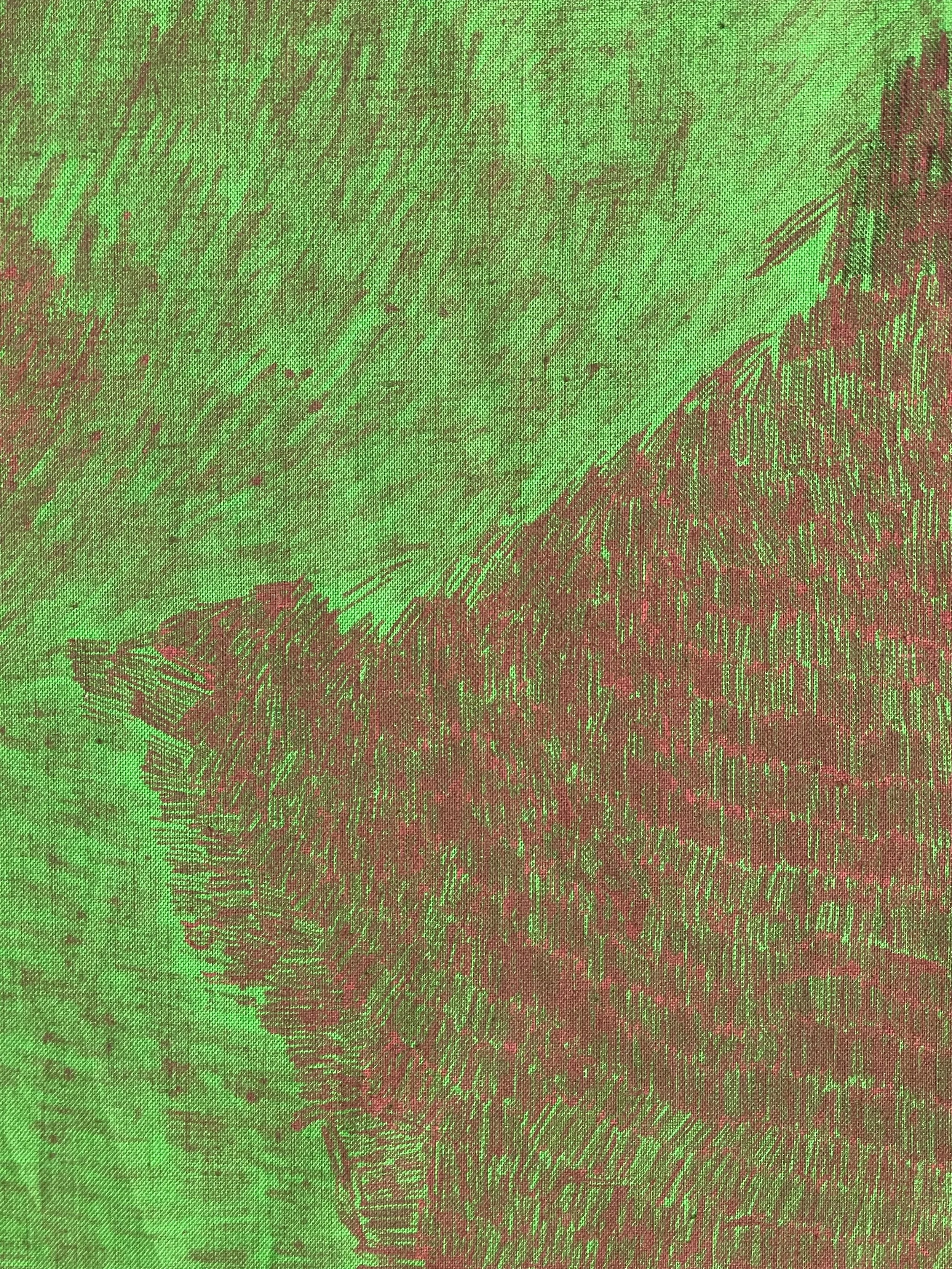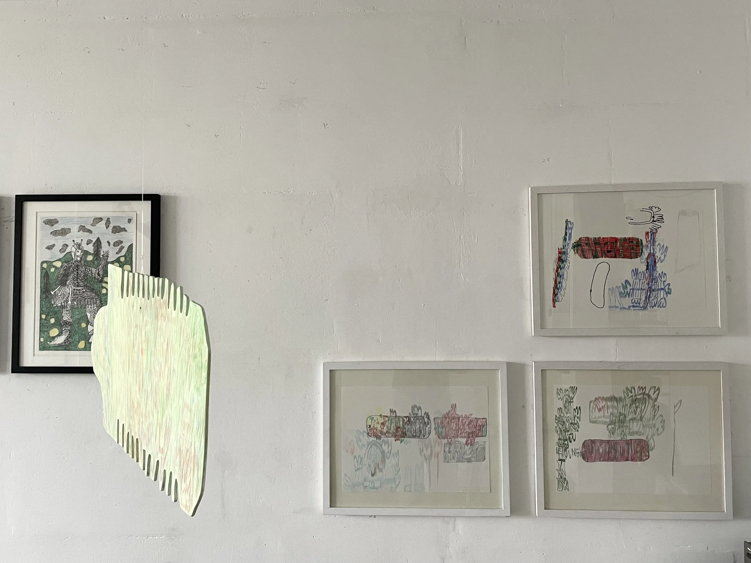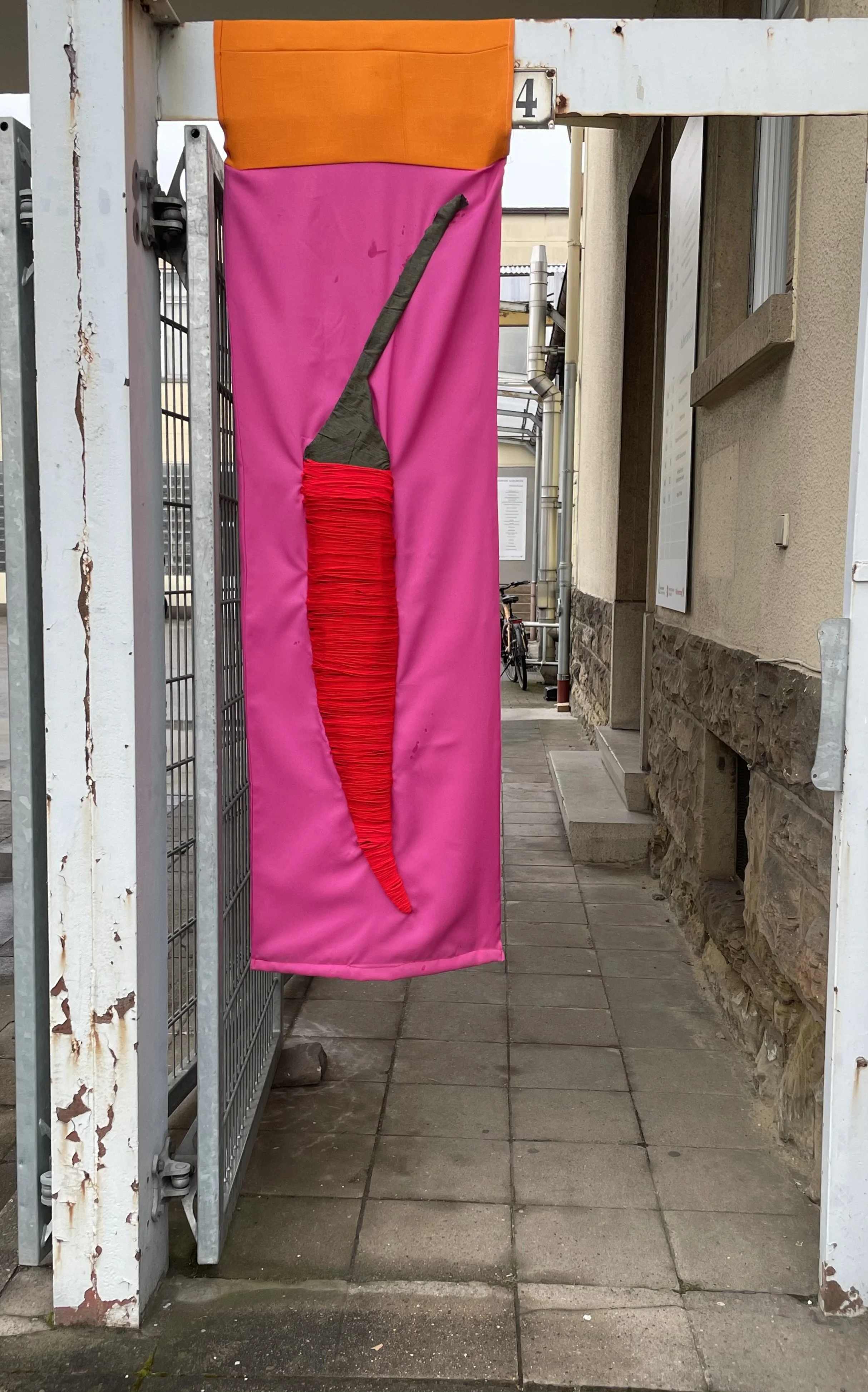 Nach dem Jahreswechsel nahmen wir mit der erweiterten Ausstellung an der Langen Nacht der Projekträume, parallel zur art Karlsruhe, teil. Eine große textile Chilifahne markierte den Eingang zu den AHOI studios und der zu Jahresbeginn begonnene Textilworkshop, begleitet durch Katharina Wenk und Daniela Schwarz, hatte schon unterschiedlichste Ergebnisse hervorgebracht, die im Ensemble gezeigt wurden.