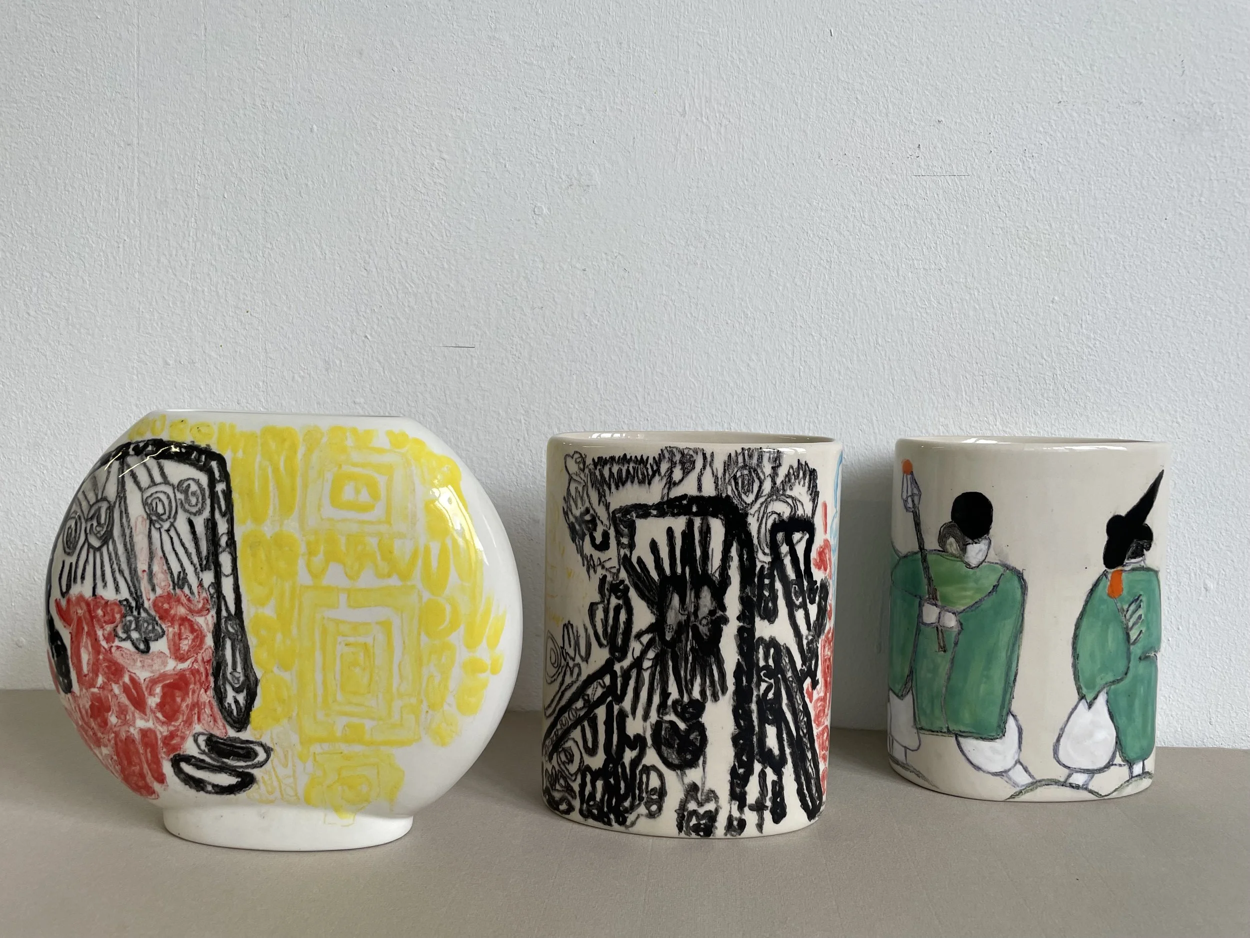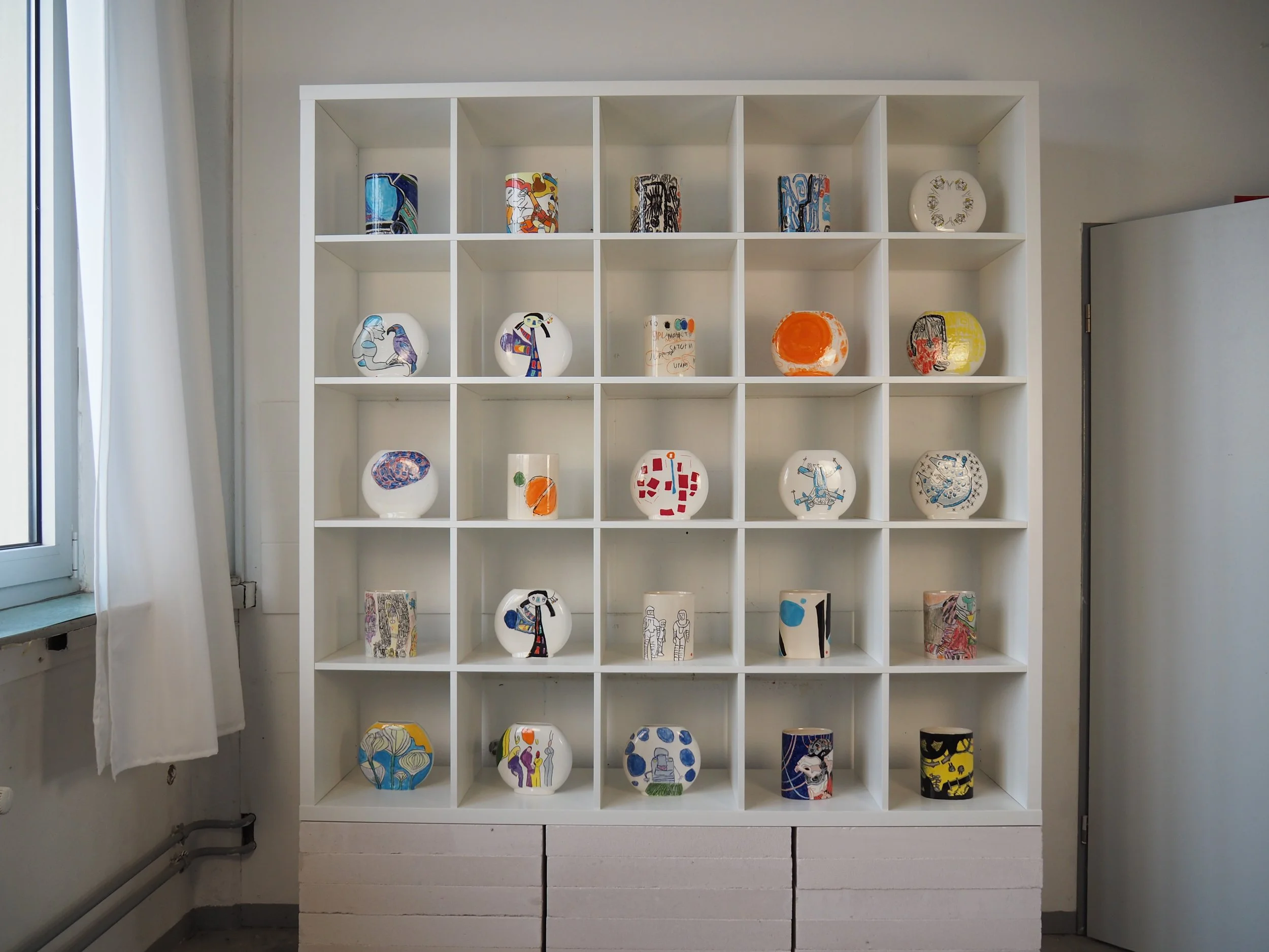 Unsere vom Thema Weltraum inspirierten Vasen, zusammen mit deren Entwürfen- alle aus 2025- wurden erstmalig in einer Gesamtschau präsentiert. Dazu waren die frischen Ergebnisse des im Herbst gestarteten Holzworkshops zu sehen, unterstützt von Jonathan Dölger. Ausgehend von den Schwirrhölzern der Aborigines waren weiterentwickelte flache Holzformen entstanden, die entweder geflämmt oder mit Kaseinfarbe bemalt und anschließend gewachst wurden. Auch die Zeichnungen, die den Prozess begleitet hatten, waren zu sehen.